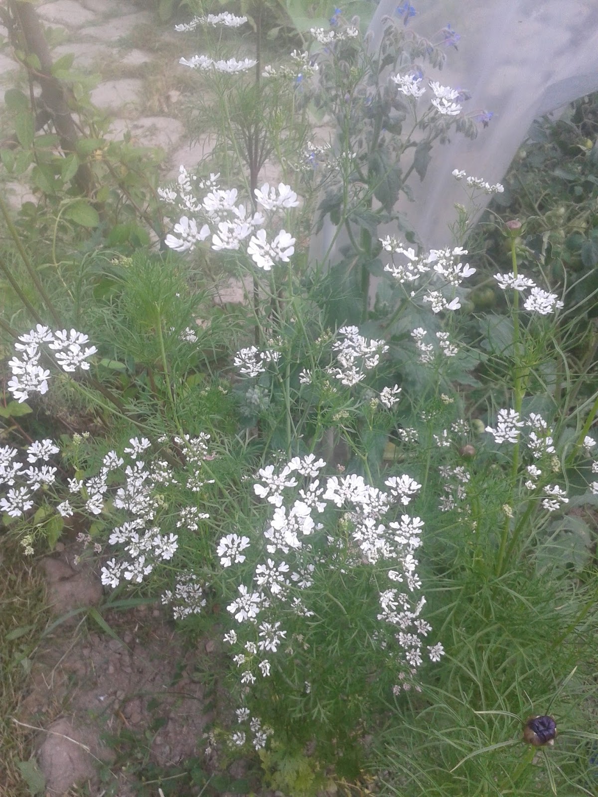 Hmmm, the flower garden. Some bits look alright, others totally chaotic, but at least there’s plenty to look at. We’ve had sweet peas, roses, nigella and cosmos in flower for a couple of weeks. And this week the dahlias and cupid’s dart started to flower. Even our coriander, which has bolted in the heat, looks gorgeous with its little white flowers.