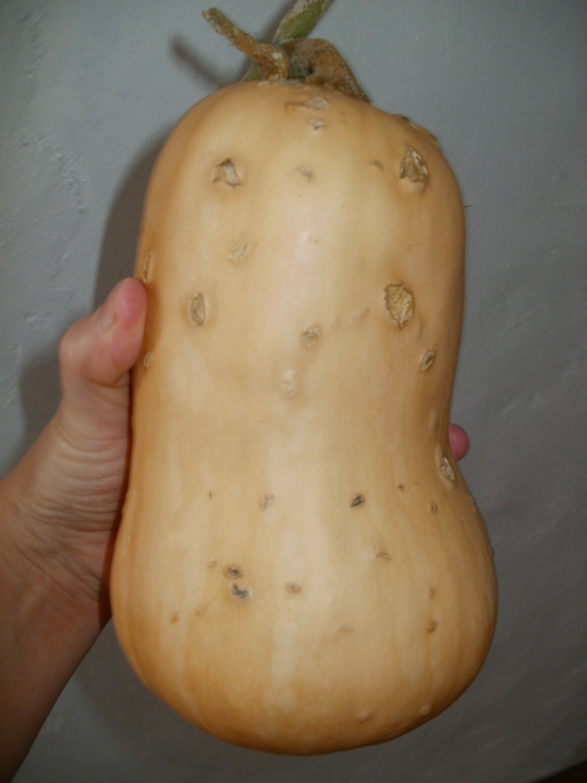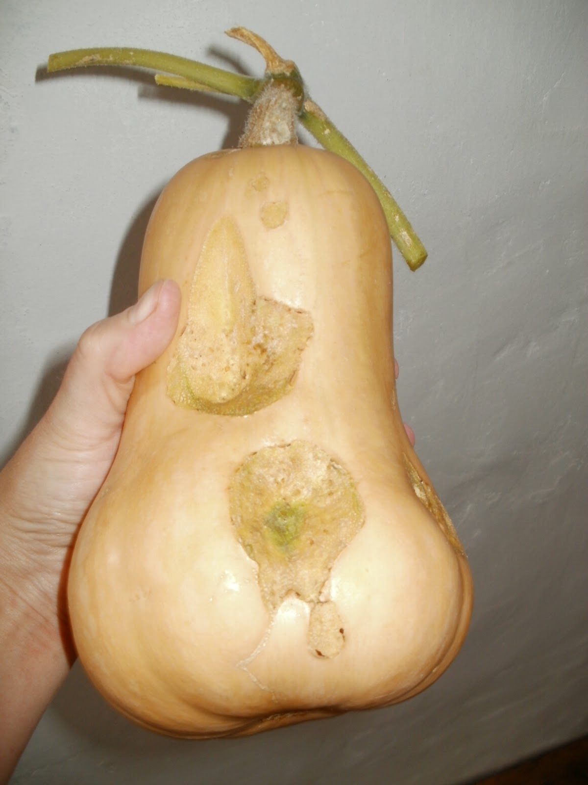 We’ve harvested our butternut squash and, thanks to the big storm (with hailstones) this summer, they’ve all got huge scars and craters in them. Just look at this poor bastard.