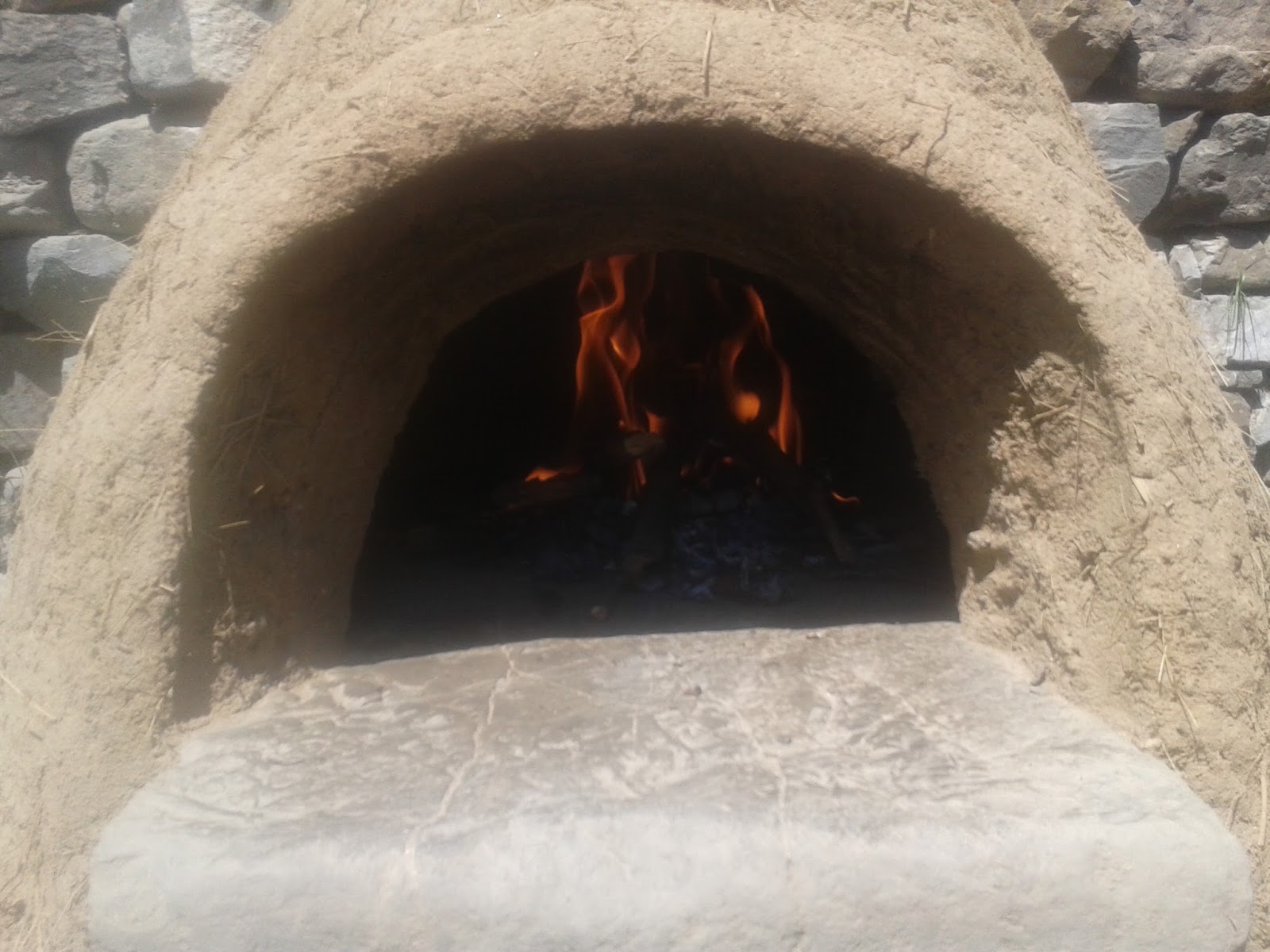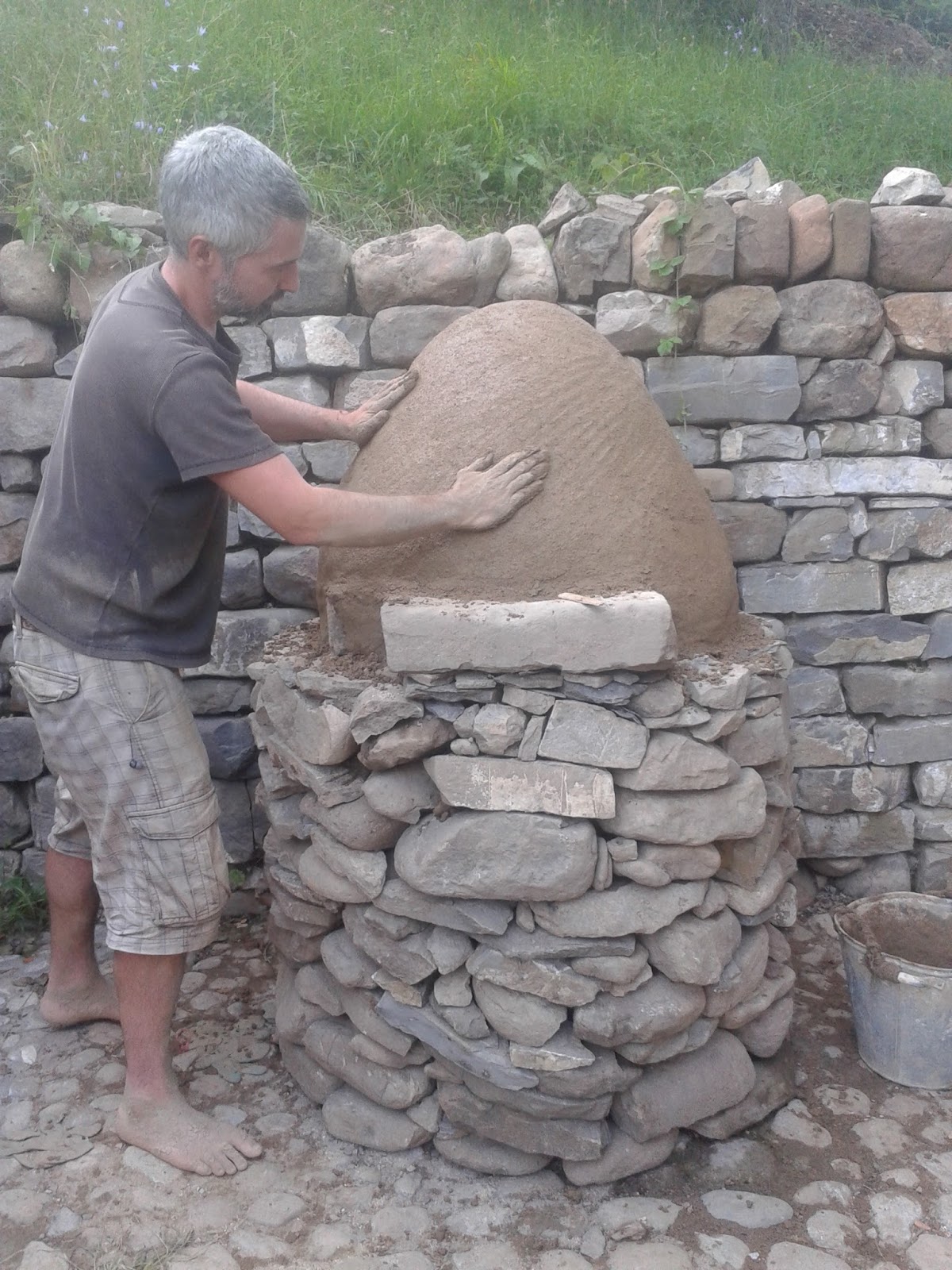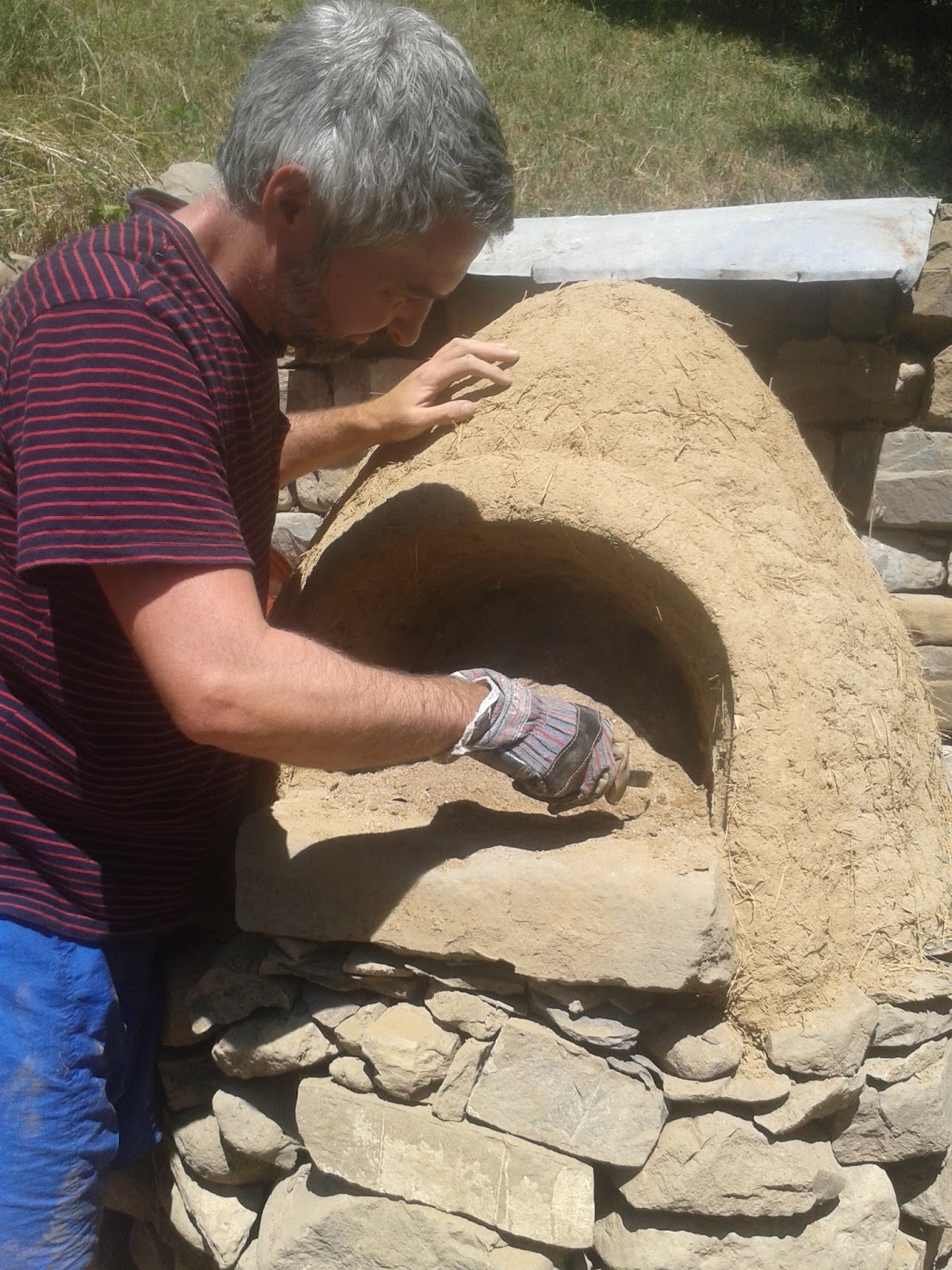 We then covered the whole oven with a layer of lime plaster, to give it some weather protection, as it was in the open part of the summer kitchen, without a roof over it. Two years later, we’ve decided to put a roof over that area, as we want to add a worktop and stove and turn it into a proper outdoor kitchen. Once the roof is done, and we no longer need to worry about the pizza oven getting wet, we’ll probably chip off the lime plaster, which has cracked and isn’t as attractive as the clay anyway.
