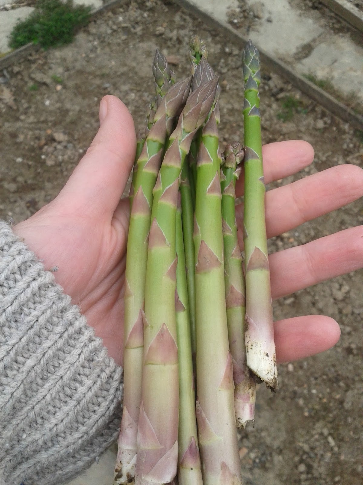 Because we grew our asparagus from seed, it’s taken a fucking ice age to get to the point where we can harvest normal amounts. By ‘ice age’ I mean four years. FOUR YEARS! Four years we’ve waited to pick enough spears to make a whole meal. Four. Years.