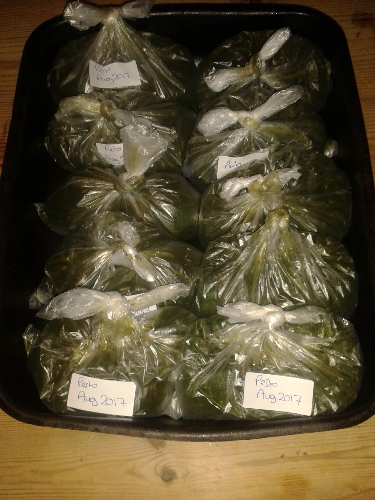 Pesto freezes really well, so we bag and freeze it. Each bag is a jar’s worth.
