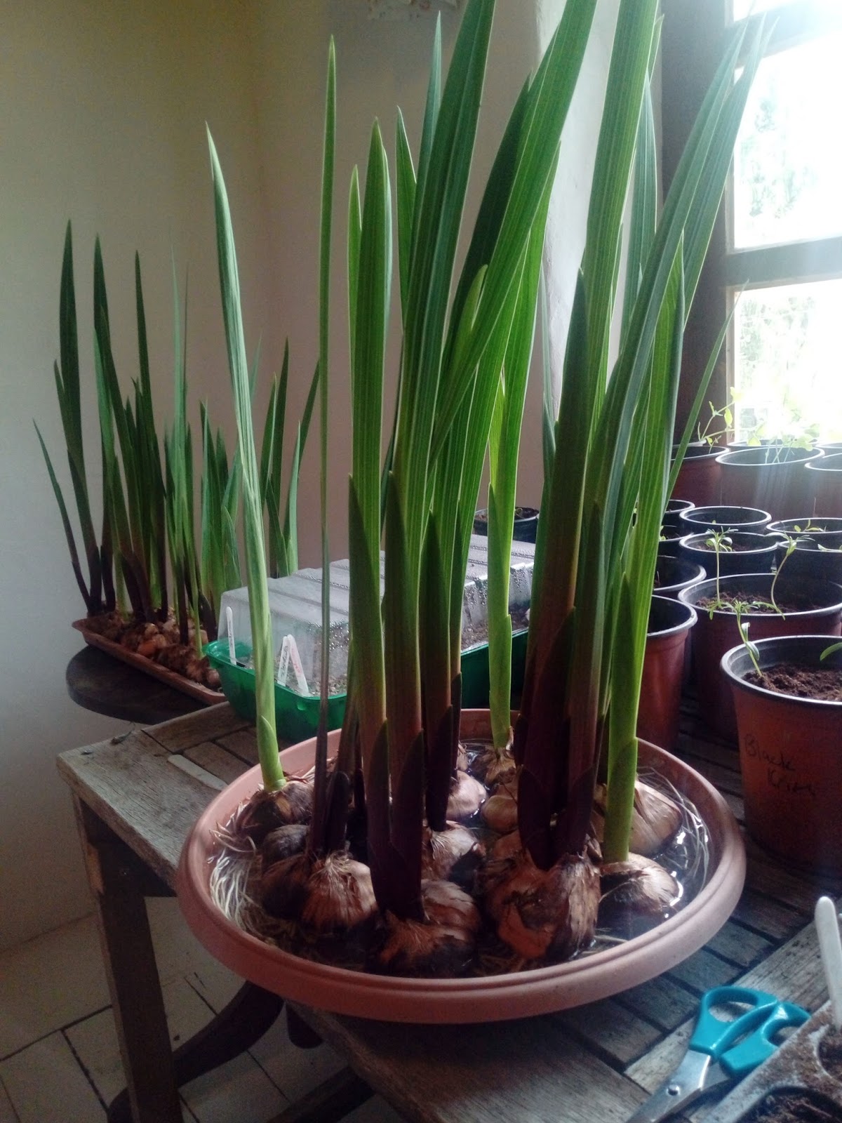 | Remember I mentioned we were forcing our gladioli bulbs in water? It works. It works ridiculously well! |