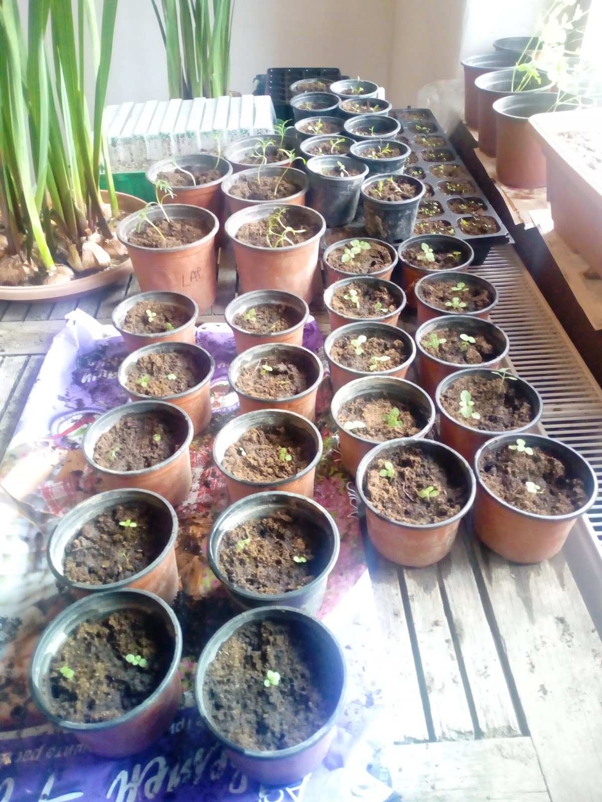| Baby snapdragons, carnations and cosmos growing in the spare room/seedling factory. |
