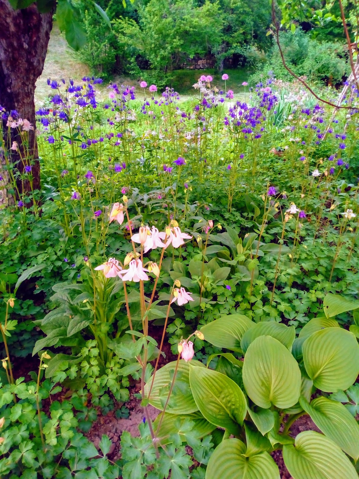 | Under the apple tree. Hosta in the foreground, then a sea of aquilegias. |