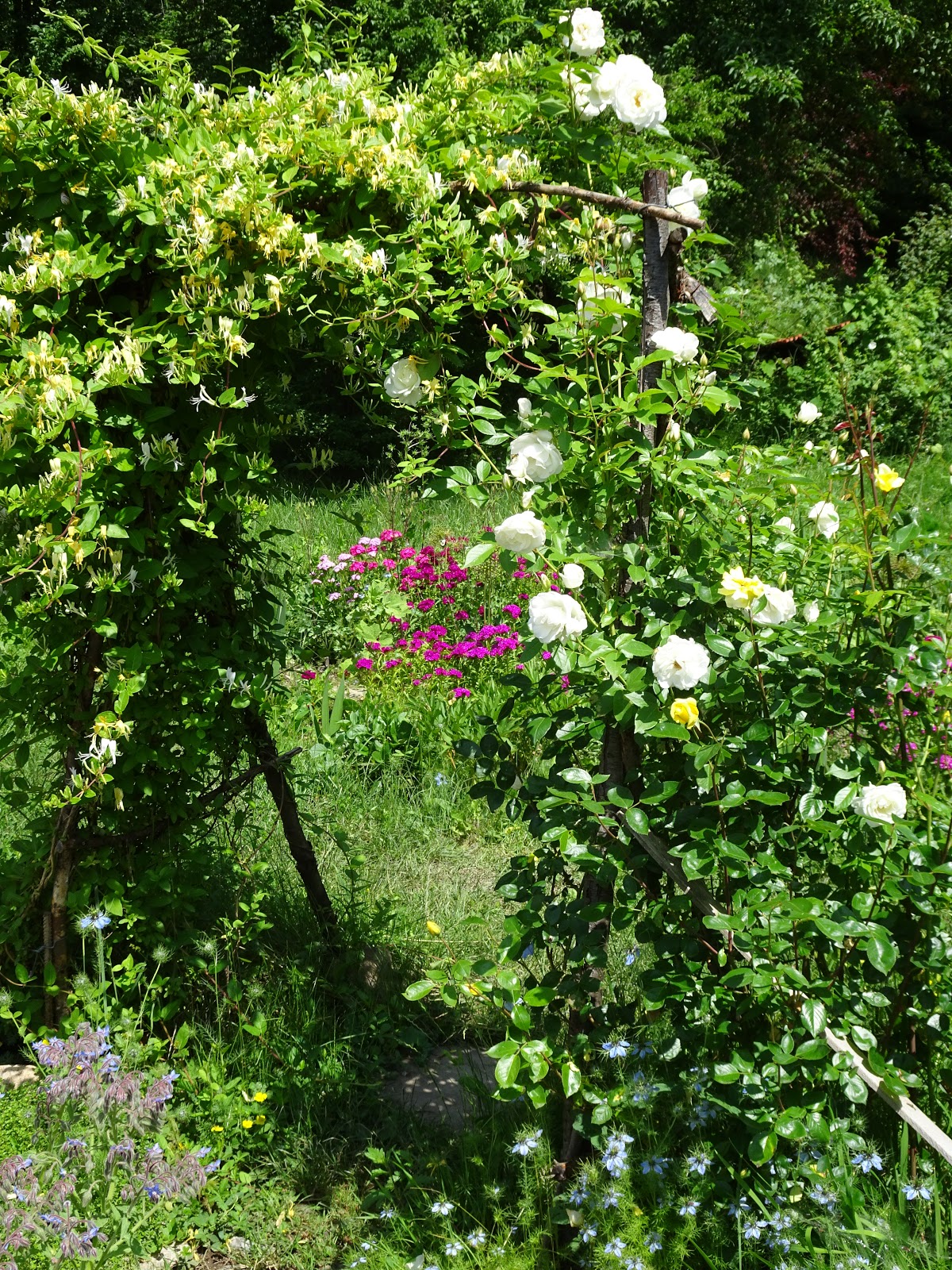 | Honeysuckle and roses in bloom at the same time. This arch is heavenly to walk through in May … so long as you don’t mind a few (dozen) bees.