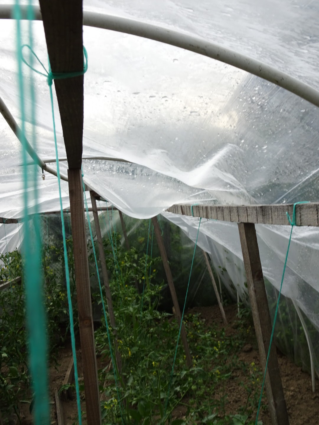 | The wonky polytunnel held up surprisingly well, even against the huge hailstones. We just had to get rid of this alarming bulge of water… |