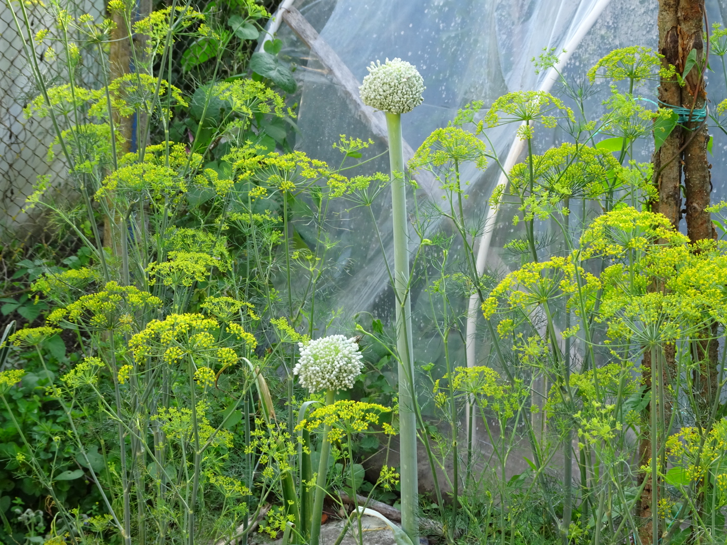 | We left a few leeks to flower and don’t they look pretty among the dill heads? |