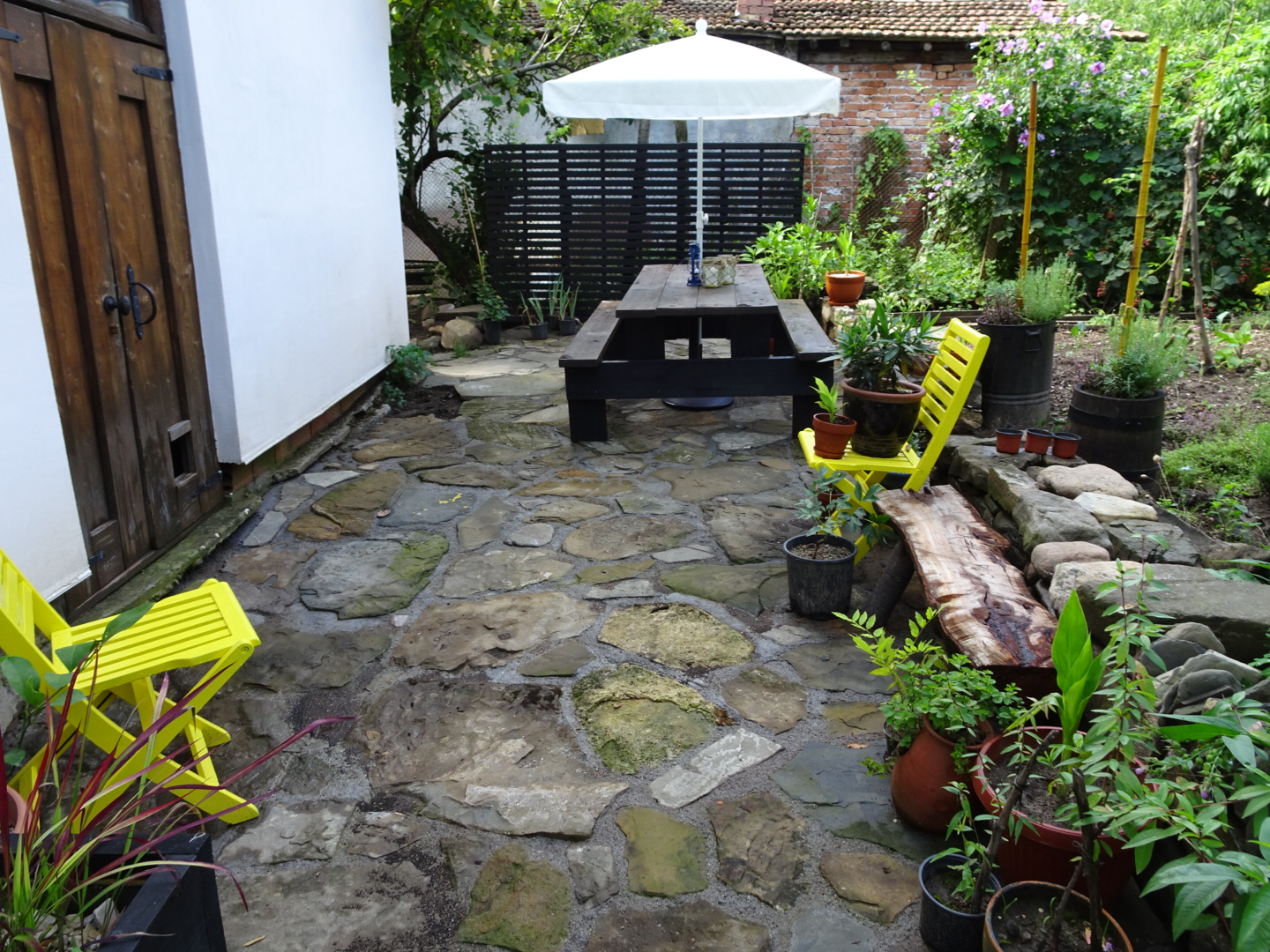 And, finally, the back terrace is finished, giving us a swish area right outside the back door to enjoy a pot of tea and survey our empire. Life’s good.