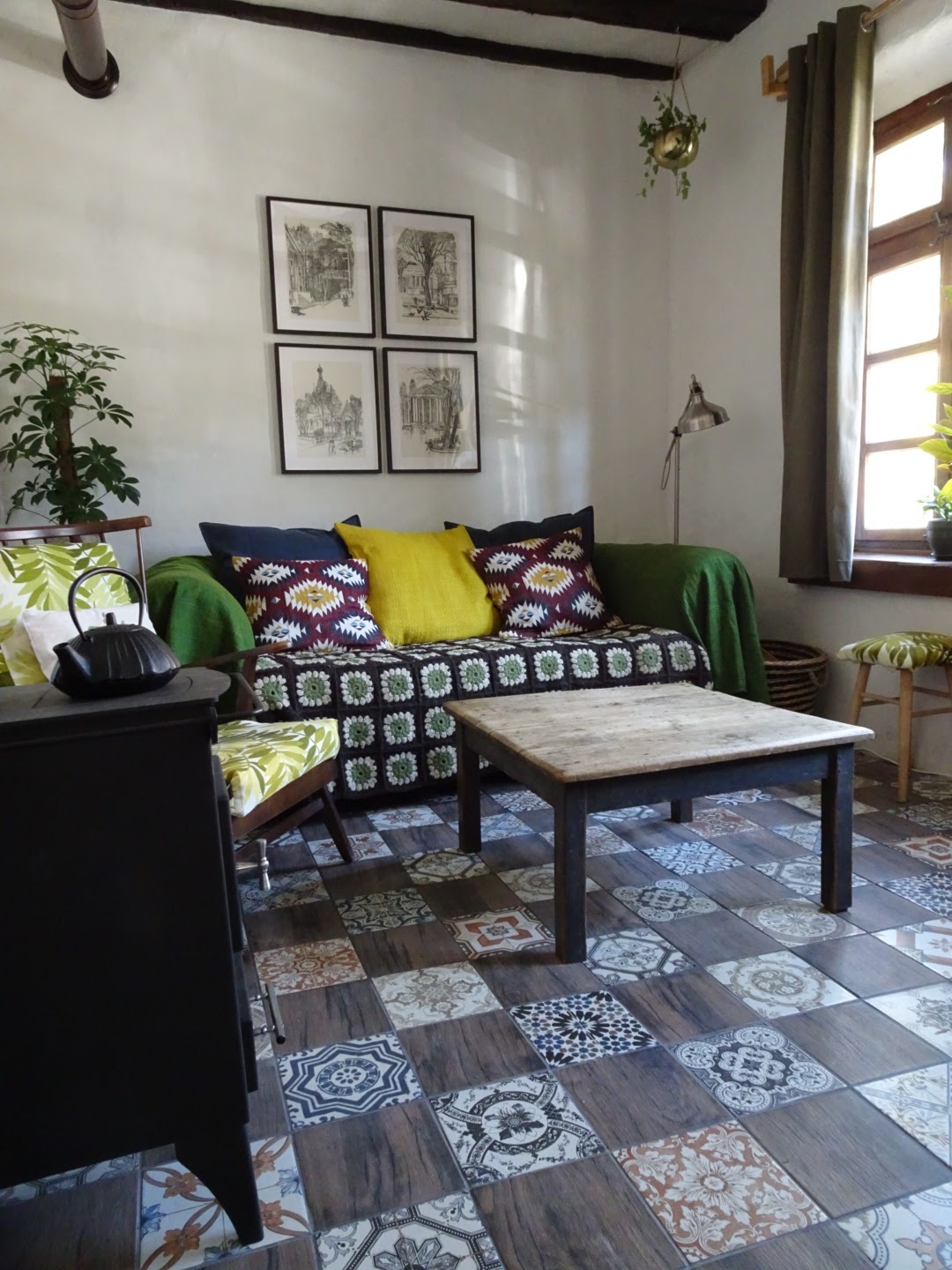 Gone is our dangerously bumpy old floor in favour of actual nice tiles. (The selection of tiles used to be awful in Bulgaria – really nasty, shiny things that Del Trotter circa 1985 would have loved – but it’s got so much better. Amazingly, we didn’t even have to travel to the big smoke of Sofia to get these lovely tiles; we found them in Botevgrad.) The tattered (but good quality, so I’m not getting rid of it) sofa has been covered with second-hand throws and blankets, and cheap cushion covers from Ikea. The pictures are drawings of Sofia that we picked up in a second-hand bookshop last winter for 15 leva. And we’ve splashed out on a gorgeous yellow rug to finish everything off, but it’s not going anywhere near that floor until the kittens stop being arseholes and learn to clean their bums properly. #LifestyleGuru