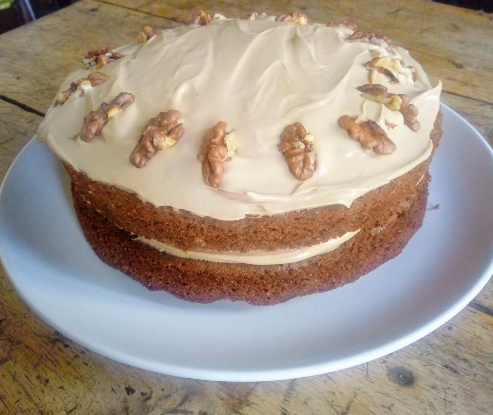 We’re still diligently catching up on Bake Off every week and baking something inspired by the programme most weekends. Last week was vegan week, which isn’t really our bag. But based on a vegan mocha cake that Briony made, I baked a (non-vegan) coffee and walnut cake, made with walnuts from our garden and coffee from … well, Lidl, obviously.