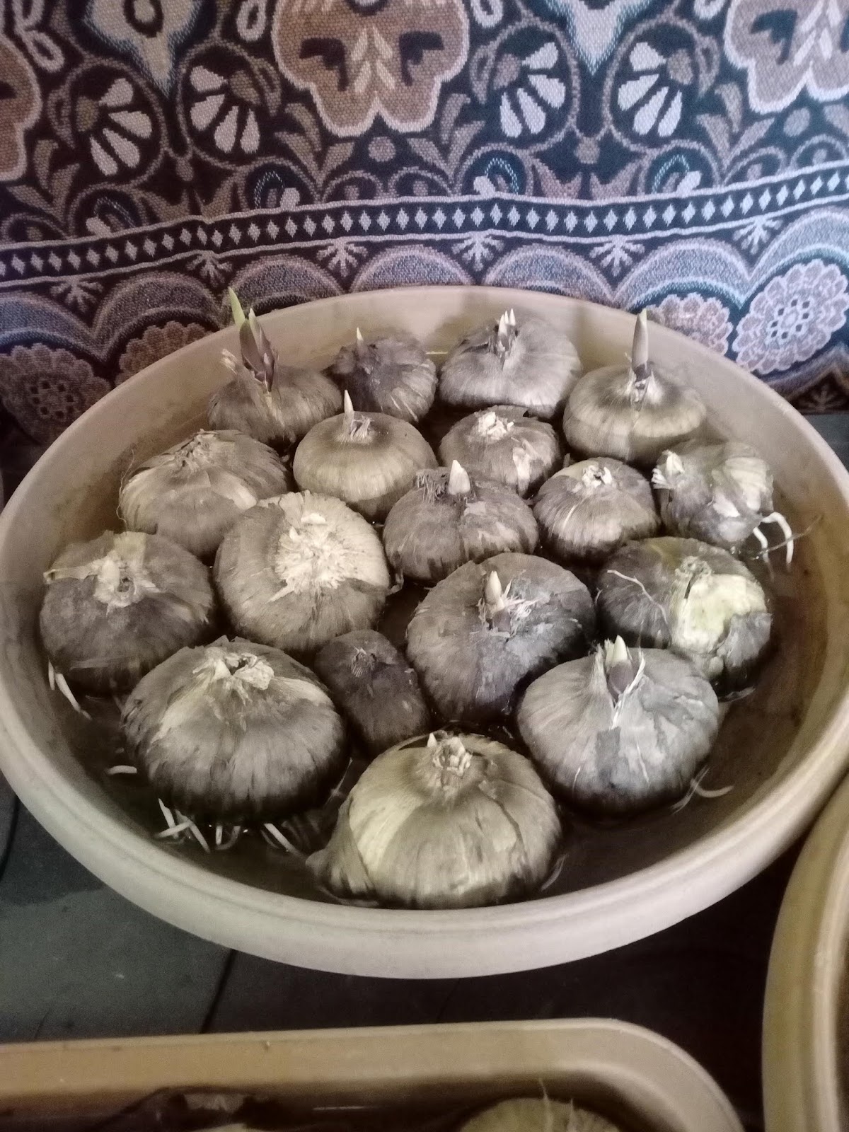 We do a similar thing with our gladioli, in that we start them off indoors. Luckily, they’re quite happy just sitting in a shallow tray of water, which saves loads of pots and compost. Look closely and you can see roots growing from the bottoms and growth starting to shoot from the tops. They’ll easily be a foot tall by the time we plant them out.
