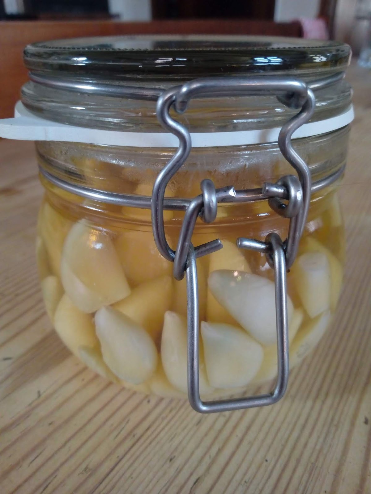 Most of the garlic in the shops at this time of year is abysmal and won’t keep for long. (We’ve long since used up our homegrown garlic from last year.) So when we finally found a stash of decent garlic in a local shop, we bought LOADS of it and spent a good hour peeling every clove to store in vinegar (again, pack the cloves into a jar and pour over hot vinegar. Store in the fridge when cool).