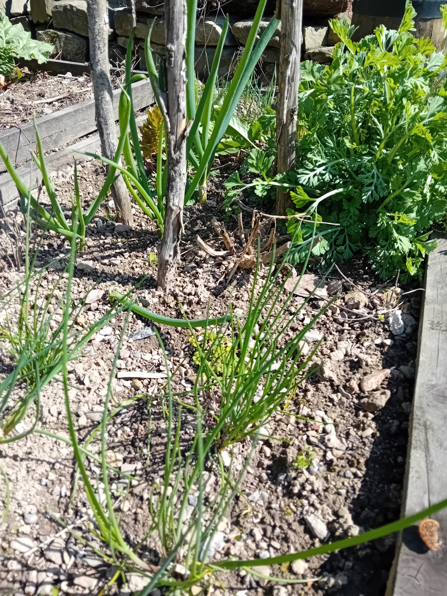 And next we have a mish-mash bed with chives, garlic chives, sorrel and a few Welsh onions. It’s always exciting to see this bed come to life – having fresh herbs is a delight after winter. (By the way, I also have another patch of Welsh onions nearer the greenhouse but didn’t take a picture of those. If you can get your hands on any, Welsh onions are wonderful things to grow. They’re perennial, clumping-forming onions, kind of like a big spring onion. Zero trouble. They just happily do their thing.)